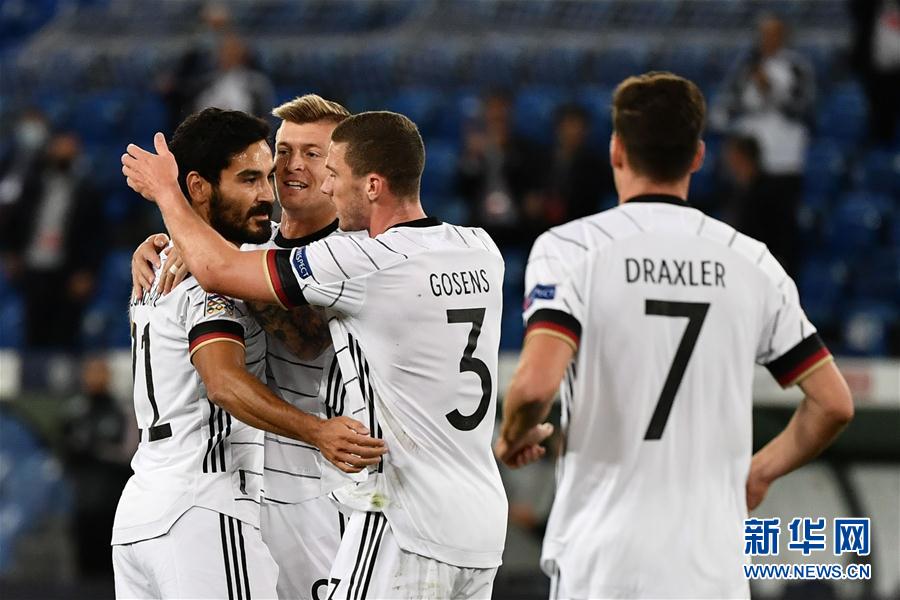 9月6日,德国队球员京多安(左一)与队友在比赛中庆祝进球。 当日,在瑞士巴塞尔进行的2020欧洲国家足球联赛A级第四组第二轮比赛中,德国队客场以1比1战平瑞士队。 新华社/法新
