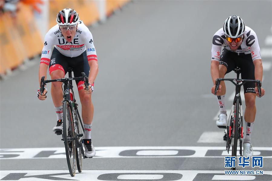 9月6日,阿联酋航空车队斯洛文尼亚车手波加查(左)和太阳网车队瑞士车手伊尔希冲过终点。 当日,2020环法自行车赛进行了第九赛段在比利牛斯山脉的比赛,赛段起点为波城,终点设在拉鲁斯,赛段全长153公里。阿联酋航空车队斯洛文尼亚选手波加查获得本站冠军,珍宝车队斯洛文尼亚选手罗格利奇穿上了象征总成绩榜第一的黄色领骑衫。 新华社/法新