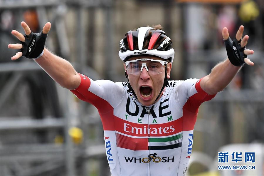 9月6日,阿联酋航空车队斯洛文尼亚选手波加查冲过终点时庆祝。 当日,2020环法自行车赛进行了第九赛段在比利牛斯山脉的比赛,赛段起点为波城,终点设在拉鲁斯,赛段全长153公里。阿联酋航空车队斯洛文尼亚选手波加查获得本站冠军,珍宝车队斯洛文尼亚选手罗格利奇穿上了象征总成绩榜第一的黄色领骑衫。 新华社/法新
