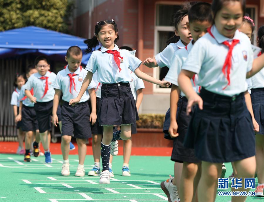9月7日,上海市徐汇区东二小学三年级7班的学生在体育课上参加趣味游戏。 当日,上海市徐汇区东二小学三年级7班的学生迎来了新学期的第四堂体育课,课程包括路队规范和趣味游戏等内容,旨在帮助学生恢复体能,强健体魄,更好地适应校园生活。 新华社记者丁汀摄