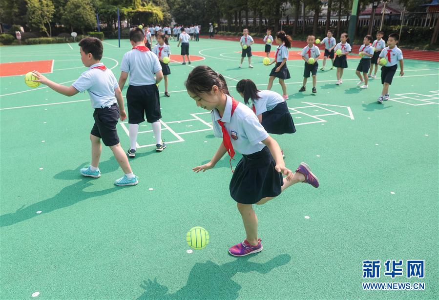 9月7日,上海市徐汇区东二小学三年级7班的学生在体育课上参加趣味游戏。 当日,上海市徐汇区东二小学三年级7班的学生迎来了新学期的第四堂体育课,课程包括路队规范和趣味游戏等内容,旨在帮助学生恢复体能,强健体魄,更好地适应校园生活。 新华社记者丁汀摄