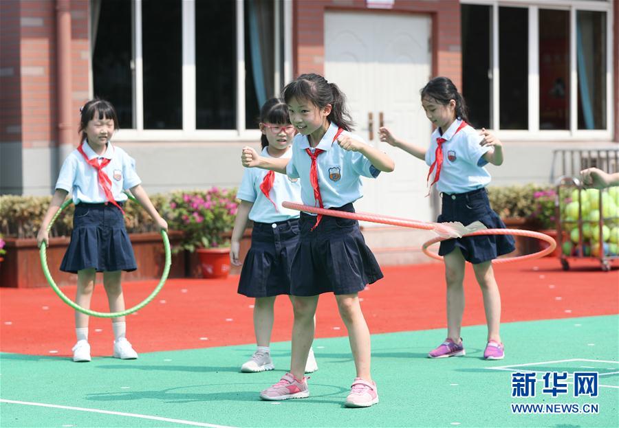 9月7日,上海市徐汇区东二小学三年级7班的学生在体育课上参加趣味游戏。 当日,上海市徐汇区东二小学三年级7班的学生迎来了新学期的第四堂体育课,课程包括路队规范和趣味游戏等内容,旨在帮助学生恢复体能,强健体魄,更好地适应校园生活。 新华社记者丁汀摄