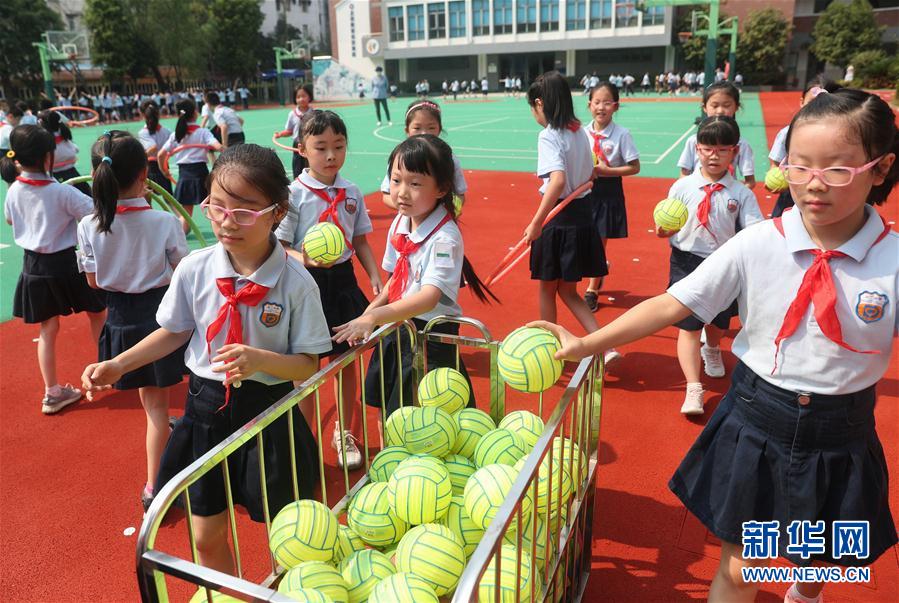 9月7日,上海市徐汇区东二小学三年级7班的学生在上体育课。 当日,上海市徐汇区东二小学三年级7班的学生迎来了新学期的第四堂体育课,课程包括路队规范和趣味游戏等内容,旨在帮助学生恢复体能,强健体魄,更好地适应校园生活。 新华社记者丁汀摄