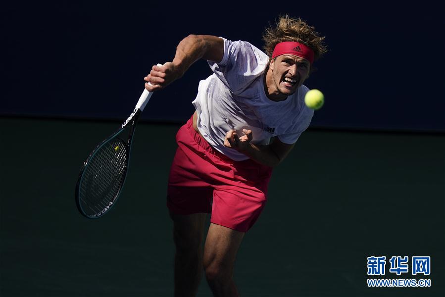 9月6日,兹维列夫在比赛中发球。 当日,在2020美国网球公开赛男单第四轮比赛中,德国选手兹维列夫以3比0战胜西班牙选手达维多维奇,晋级下一轮。 新华社/美联