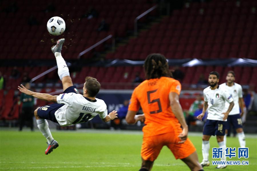 9月7日,意大利队球员巴雷拉(左)在比赛中倒钩射门。 当日,在瑞士巴塞尔进行的2020欧洲国家足球联赛A级第一组第二轮比赛中,意大利队以1比0战胜荷兰队。 新华社/美联
