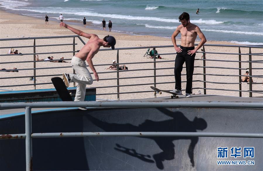 9月8日,两名滑板爱好者在悉尼邦迪海滩旁的滑板场练习。 日前,位于南半球的澳大利亚进入春季,随着疫情逐步得到控制,悉尼市民纷纷来到户外健身。 新华社记者白雪飞摄