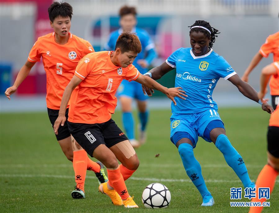 9月8日,江苏苏宁女足队球员塔比莎(右)在比赛中与山东体彩队球员张文昭拼抢。 当日,在2020年中国足球协会女子足球超级联赛第六轮比赛中,江苏苏宁女足队以4比1战胜山东体彩队。 新华社发(陈欣波摄)