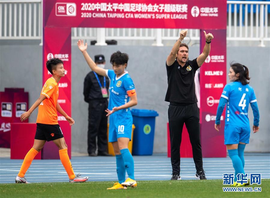 9月8日,江苏苏宁女足队主教练杰斯林(右二)在场边示意。 当日,在2020年中国足球协会女子足球超级联赛第六轮比赛中,江苏苏宁女足队以4比1战胜山东体彩队。 新华社发(陈欣波摄)