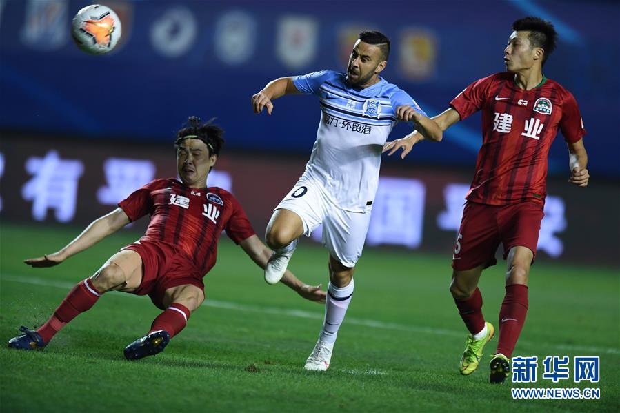 9月8日,广州富力队球员萨巴(中)在比赛中带球进攻。 当日,在2020赛季中国足球协会超级联赛第一阶段(大连赛区)第十轮比赛中,广州富力队以3比1战胜河南建业队。 新华社记者 龙雷 摄