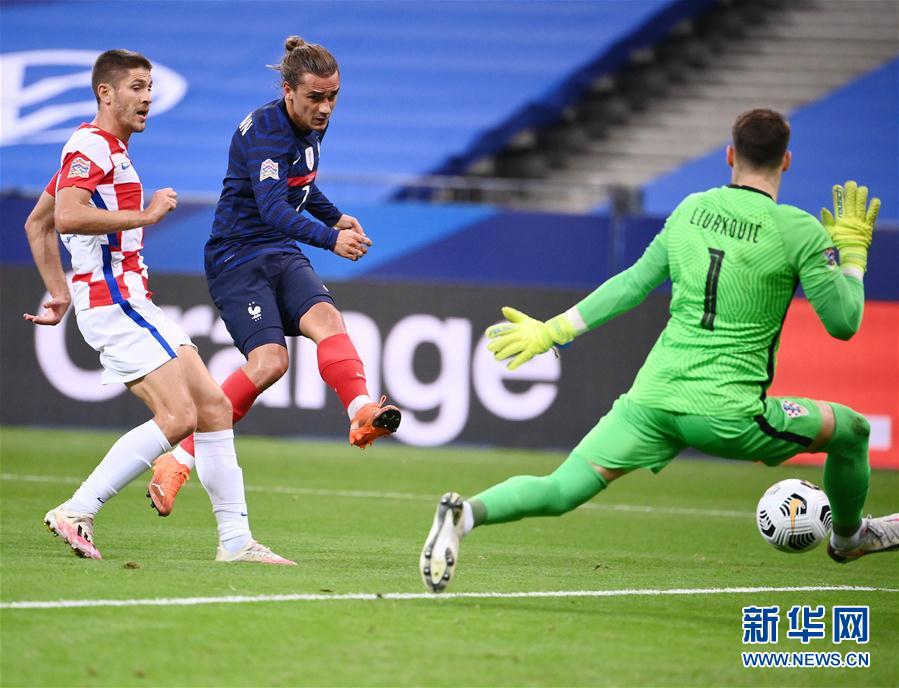 9月8日,法国队球员格列兹曼(中)在比赛中射门得分。 当日,在法国圣但尼举行的2020欧洲国家足球联赛A级第三组第二轮比赛中,法国队主场以4比2战胜克罗地亚队。 新华社/法新