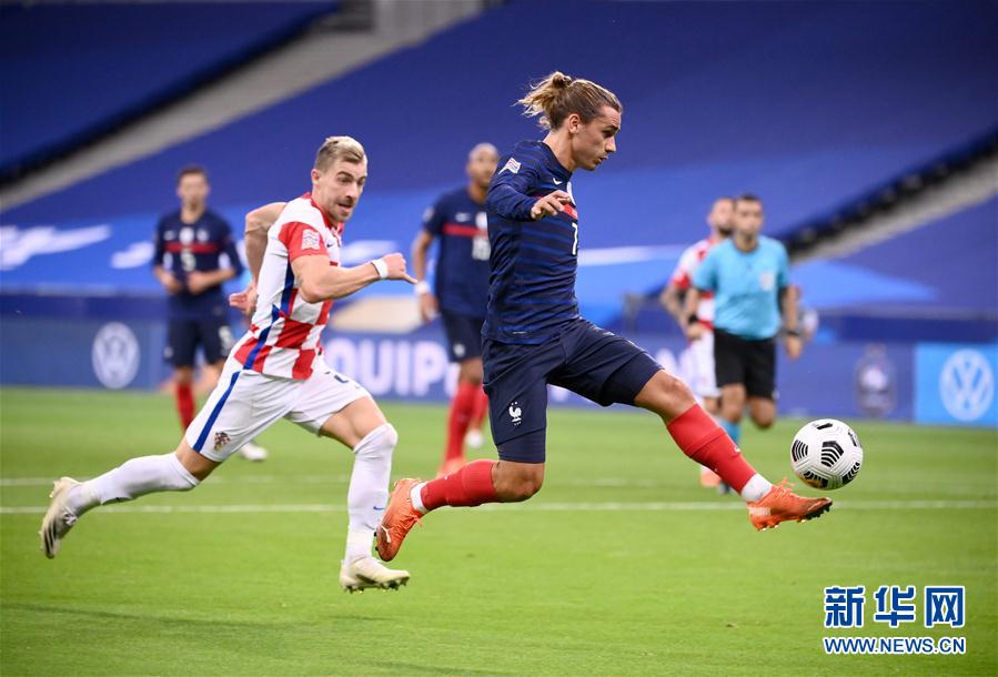 9月8日,法国队球员格列兹曼(右)在比赛中停球。 当日,在法国圣但尼举行的2020欧洲国家足球联赛A级第三组第二轮比赛中,法国队主场以4比2战胜克罗地亚队。 新华社/法新