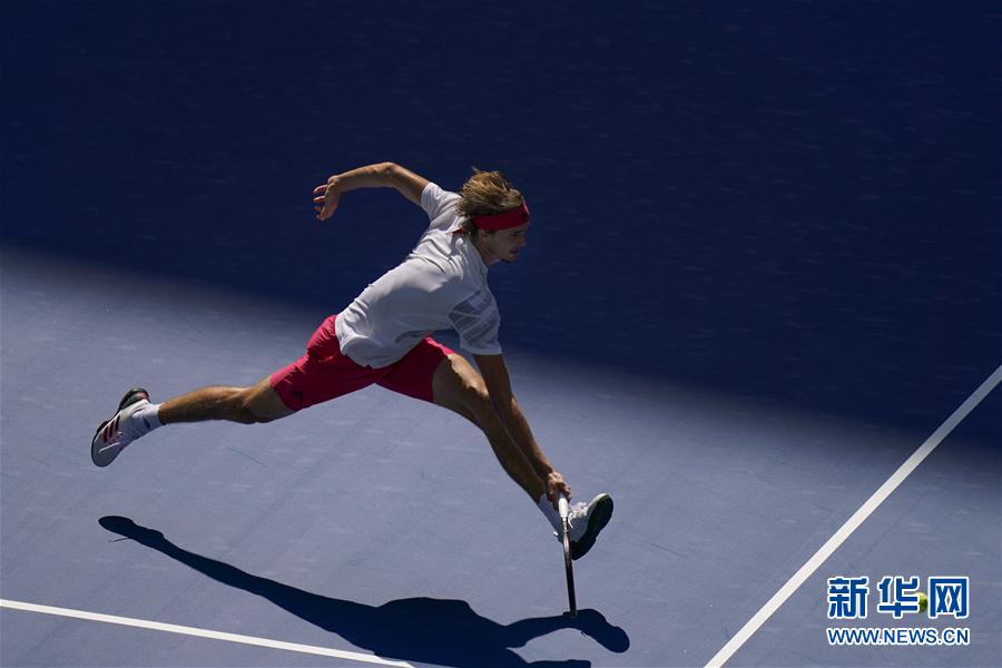 9月8日,兹维列夫在比赛中回球。 当日,在2020美国网球公开赛男单四分之一决赛中,德国选手兹维列夫以3比1战胜克罗地亚选手乔里奇,晋级四强。 新华社/美联