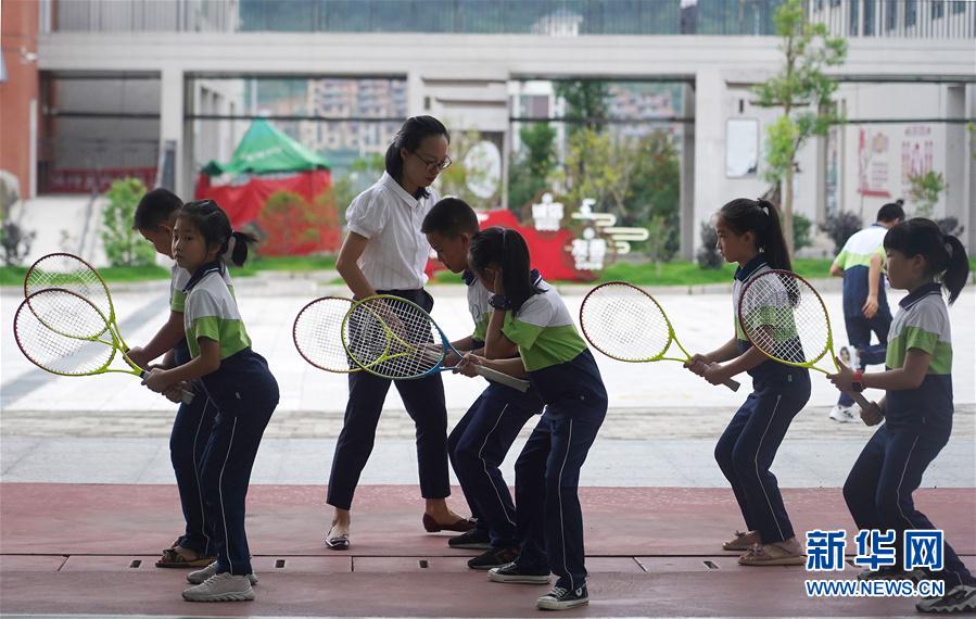9月9日,在江西省崇义县思源实验学校,小学三年级学生进行网球操训练。 当日,江西省崇义县思源实验学校的小学生们迎来了新学期的趣味网球课。据了解,该校长期开设短式网球的特色课,从普及网球规则、文化及礼仪等开始启蒙,从教学、训练、比赛三方面开展课程。 新华社记者 万象 摄
