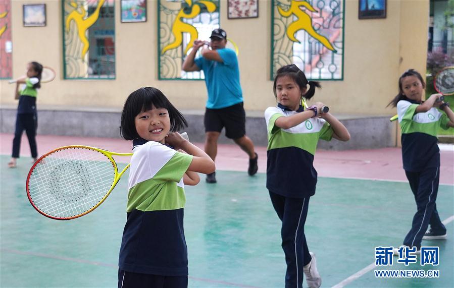 9月9日,在江西省崇义县思源实验学校,小学三年级学生进行网球操训练。 当日,江西省崇义县思源实验学校的小学生们迎来了新学期的趣味网球课。据了解,该校长期开设短式网球的特色课,从普及网球规则、文化及礼仪等开始启蒙,从教学、训练、比赛三方面开展课程。 新华社记者 万象 摄