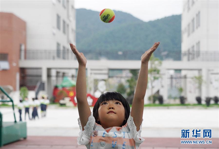 9月9日,在江西省崇义县思源实验学校,小学一年级新生在进行抛球训练。 当日,江西省崇义县思源实验学校的小学生们迎来了新学期的趣味网球课。据了解,该校长期开设短式网球的特色课,从普及网球规则、文化及礼仪等开始启蒙,从教学、训练、比赛三方面开展课程。 新华社记者 万象 摄