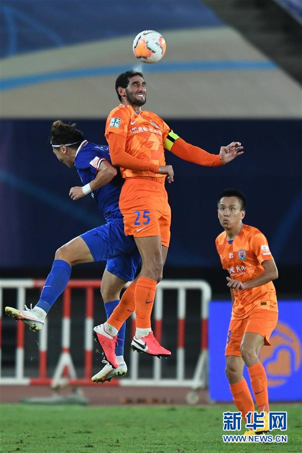 9月9日,山东鲁能泰山队球员费莱尼(中)在比赛中争顶。 当日,在2020赛季中国足球协会超级联赛第一阶段(大连赛区)第十轮比赛中,上海绿地申花队以1比1战平山东鲁能泰山队。 新华社记者 龙雷 摄