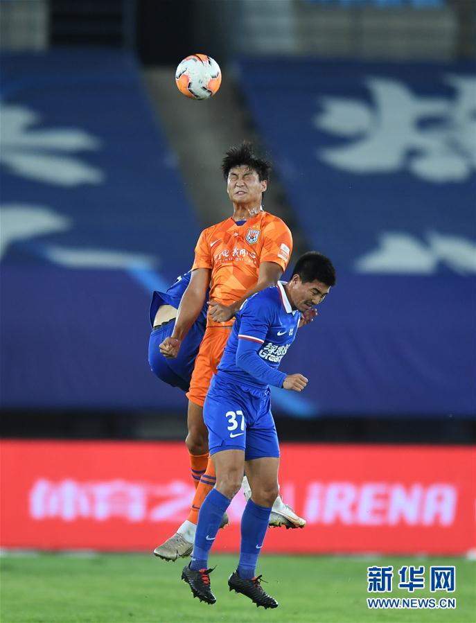9月9日,山东鲁能泰山队球员郭田雨(上)在比赛中争顶。 当日,在2020赛季中国足球协会超级联赛第一阶段(大连赛区)第十轮比赛中,上海绿地申花队以1比1战平山东鲁能泰山队。 新华社记者 龙雷 摄