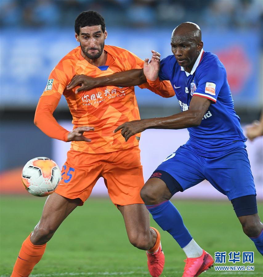 9月9日,山东鲁能泰山队球员费莱尼(左)在比赛中与上海绿地申花队球员姆比亚拼抢。 当日,在2020赛季中国足球协会超级联赛第一阶段(大连赛区)第十轮比赛中,上海绿地申花队以1比1战平山东鲁能泰山队。 新华社记者 龙雷 摄