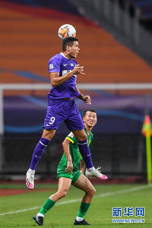 9月10日,天津泰达队球员桑德罗·利马(上)在比赛中争顶。 当日,在2020赛季中国足球协会超级联赛第一阶段(苏州赛区)第十轮比赛中,北京中赫国安队以2比0战胜天津泰达队。 新华社记者李博摄