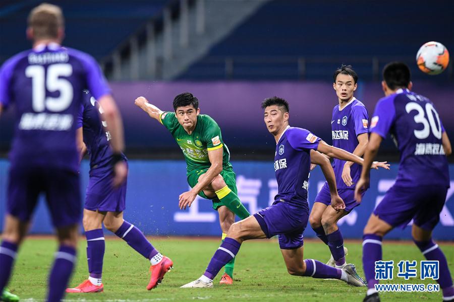 9月10日,北京中赫国安队球员张玉宁(右四)在比赛中射门。 当日,在2020赛季中国足球协会超级联赛第一阶段(苏州赛区)第十轮比赛中,北京中赫国安队以2比0战胜天津泰达队。 新华社记者李博摄