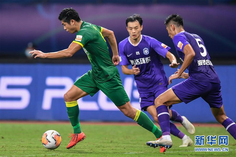 9月10日,北京中赫国安队球员张玉宁(左)在比赛中进攻。 当日,在2020赛季中国足球协会超级联赛第一阶段(苏州赛区)第十轮比赛中,北京中赫国安队以2比0战胜天津泰达队。 新华社记者李博摄
