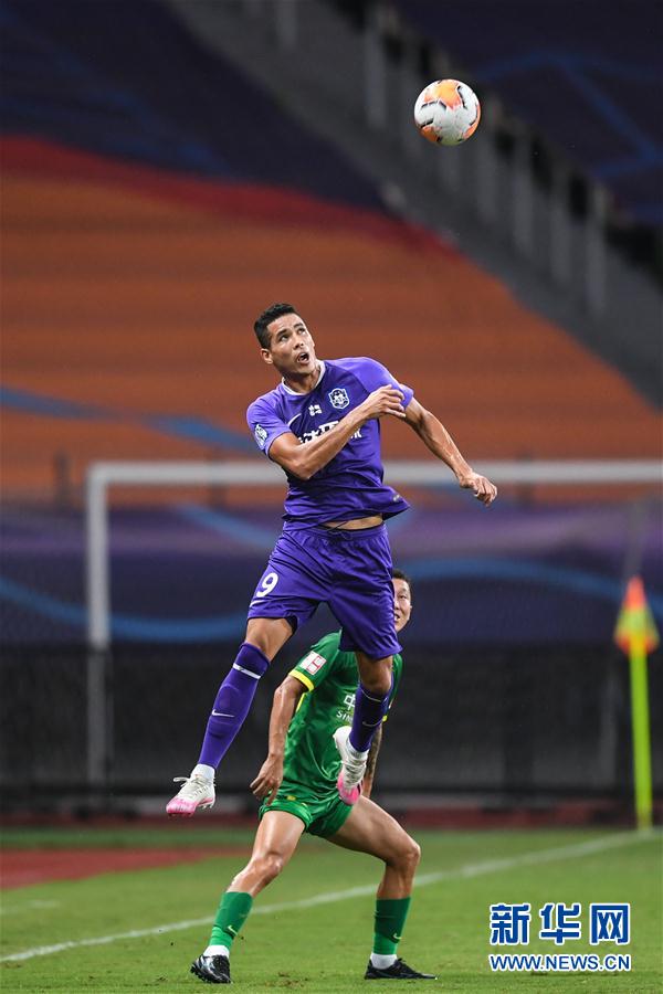 9月10日,天津泰达队球员桑德罗·利马(上)在比赛中争顶。 当日,在2020赛季中国足球协会超级联赛第一阶段(苏州赛区)第十轮比赛中,北京中赫国安队以2比0战胜天津泰达队。 新华社记者李博摄
