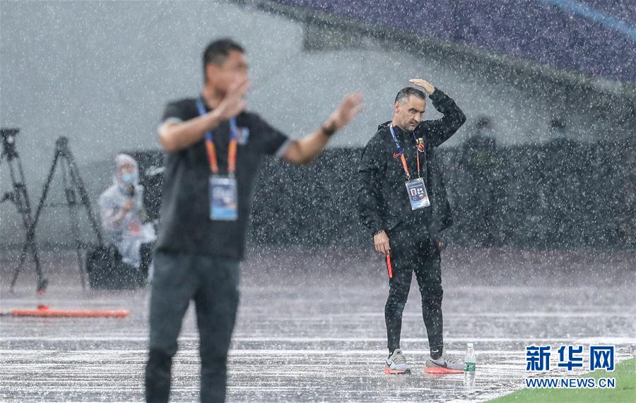 9月10日,上海上港队主教练佩雷拉(右)在比赛中。 当日,在2020赛季中国足球协会超级联赛第一阶段(苏州赛区)第十轮比赛中,上海上港队以2比1战胜青岛黄海青港队。 新华社记者杨磊摄