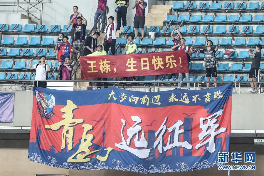 9月10日,青岛黄海青港队球迷在为球队加油。 当日,在2020赛季中国足球协会超级联赛第一阶段(苏州赛区)第十轮比赛中,上海上港队以2比1战胜青岛黄海青港队。 新华社记者杨磊摄