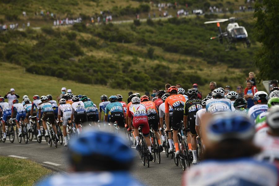 9月11日,参赛选手在比赛中。 当日,2020年环法自行车赛迎来了艰苦的第13赛段,车手们骑行在法国中央高原全长191.5公里的赛道上,途中要克服7个不同级别的爬坡路段,其中终点前更是连续包含1个二级坡和1个一级坡。黄色领骑衫拥有者罗格利奇在本赛段发挥稳定,进一步扩大了在总积分榜上的优势;赛段冠军由英孚车队的哥伦比亚车手马丁内斯获得。 新华社/法新