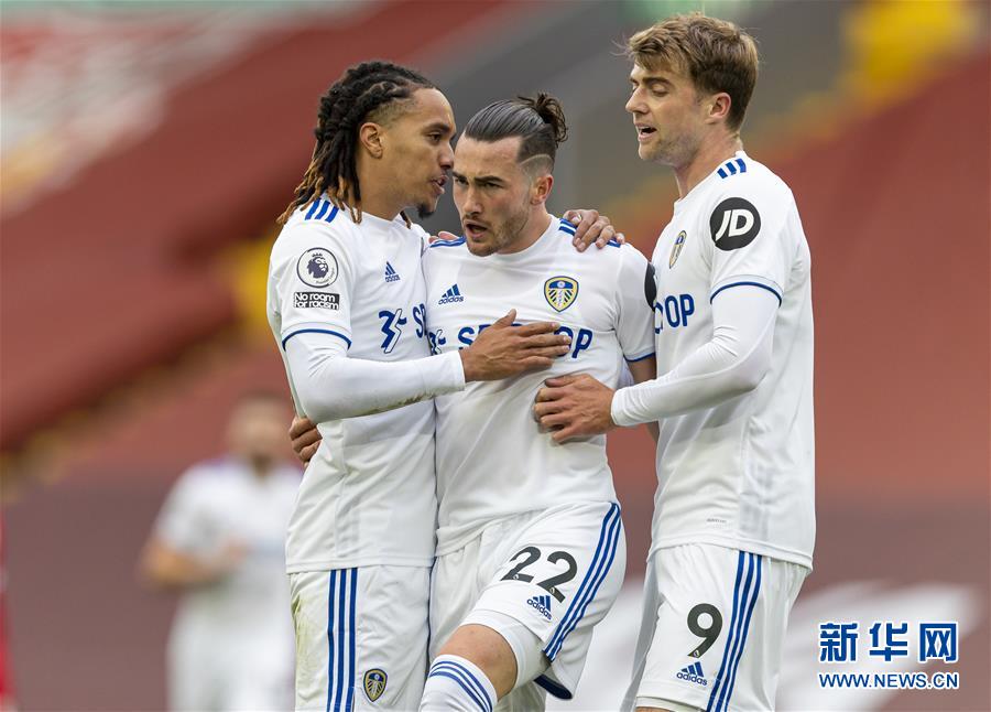 9月12日,利兹联队球员哈里森(中)在进球后与队友庆祝。 当日,2020-2021赛季英格兰足球超级联赛开赛。在首轮比赛中,卫冕冠军利物浦队主场以4比3战胜利兹联队。 新华社发