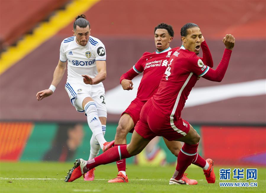 9月12日,利兹联队球员哈里森(左)在比赛中射门得分。 当日,2020-2021赛季英格兰足球超级联赛开赛。在首轮比赛中,卫冕冠军利物浦队主场以4比3战胜利兹联队。 新华社发