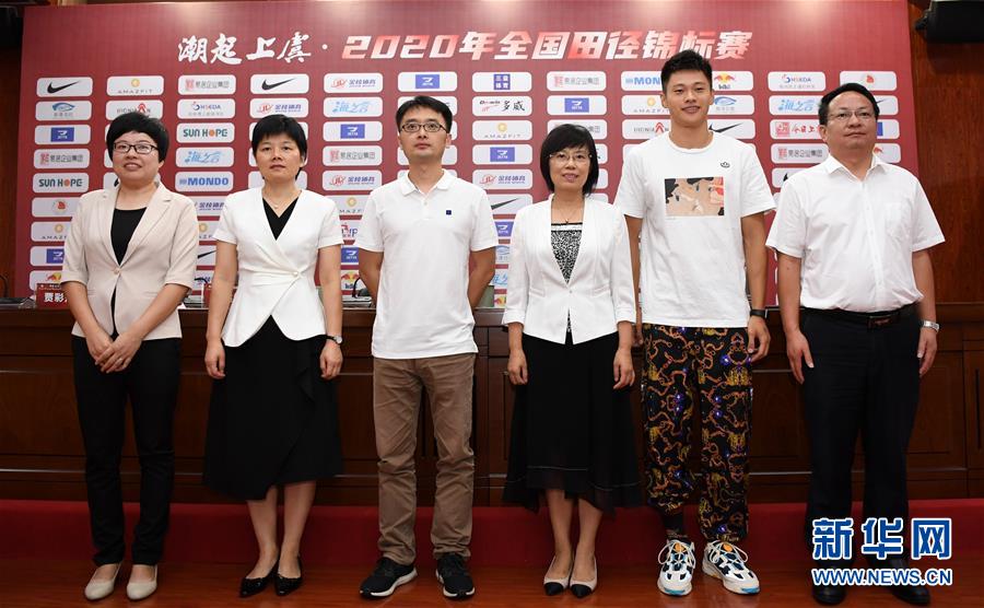 9月13日,中国田径协会竞赛部副主任杨烽(左三)、短跑运动员谢震业(右二)在新闻发布会后合影。 当日,2020年全国田径锦标赛新闻发布会在浙江省绍兴市上虞区举行。本次比赛将于9月15日至18日在上虞体育中心进行。 新华社记者 贾宇辰 摄