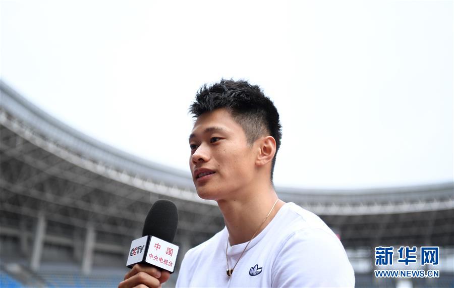 9月13日,短跑运动员谢震业在新闻发布会后接受媒体采访。 当日,2020年全国田径锦标赛新闻发布会在浙江省绍兴市上虞区举行。本次比赛将于9月15日至18日在上虞体育中心进行。 新华社记者 贾宇辰 摄