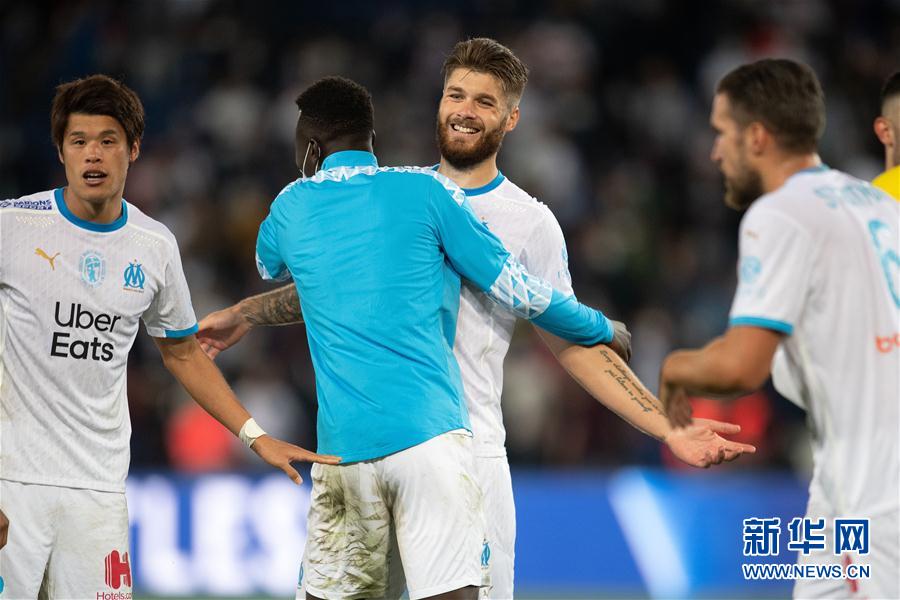 9月13日,马赛队球员卡莱塔·卡尔(左三)与队友庆祝胜利。 当日,在2020-2021赛季法国足球甲级联赛第三轮比赛中,巴黎圣日耳曼队主场以0比1不敌马赛队。 新华社发(杰克·陈摄)
