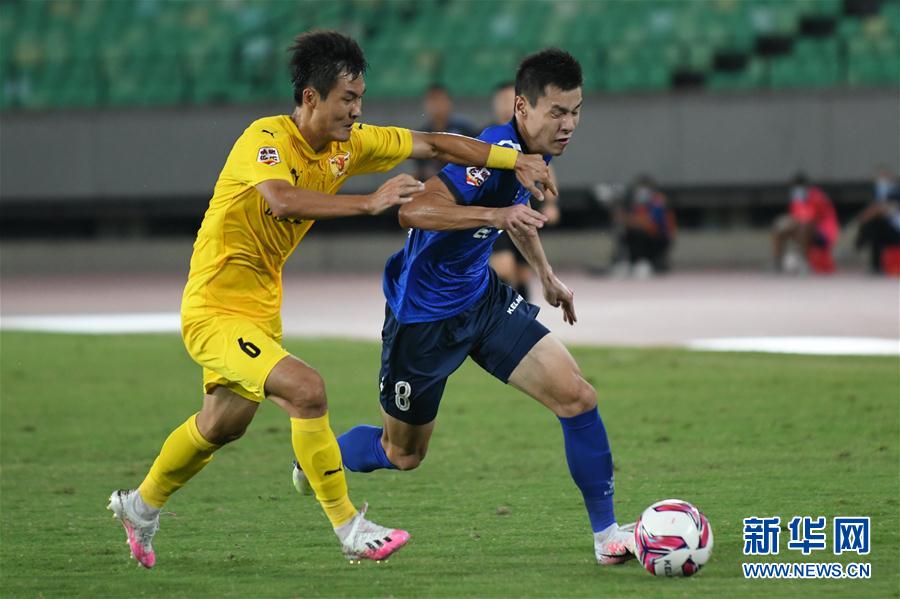 9月13日,四川优必选队球员李浩杰(左)在比赛中防守昆山FC队球员吴宇帆的进攻。 当日,在2020赛季中国足球协会甲级联赛第一阶段(常州赛区)第1轮比赛中,昆山FC队以2比0战胜四川优必选队。 新华社发(史康 摄)