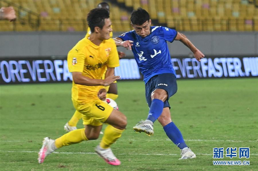 9月13日,昆山FC队球员曹海清(右)在比赛中射门。 当日,在2020赛季中国足球协会甲级联赛第一阶段(常州赛区)第1轮比赛中,昆山FC队以2比0战胜四川优必选队。 新华社发(史康 摄)