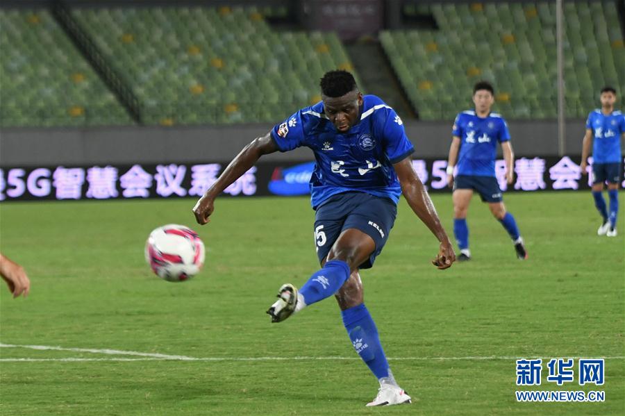 9月13日,昆山FC队球员阿德尼吉在比赛中射门。 当日,在2020赛季中国足球协会甲级联赛第一阶段(常州赛区)第1轮比赛中,昆山FC队以2比0战胜四川优必选队。 新华社发(史康 摄)