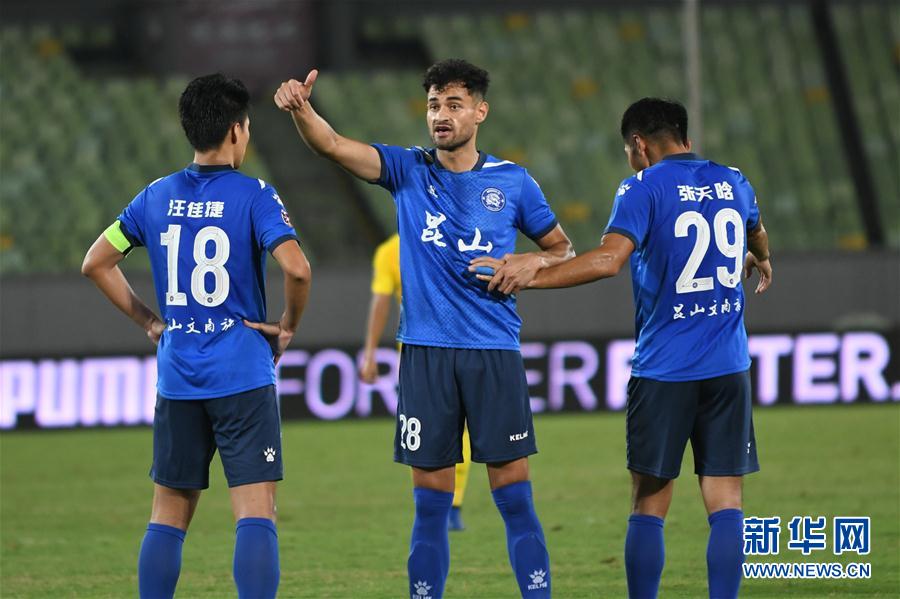 9月13日,昆山FC队球员皮里(中)在比赛中与队友排人墙防守。 当日,在2020赛季中国足球协会甲级联赛第一阶段(常州赛区)第1轮比赛中,昆山FC队以2比0战胜四川优必选队。 新华社发(史康 摄)