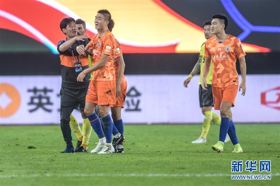 9月13日,山东鲁能泰山队主教练李霄鹏(左)在比赛中劝阻被红牌罚下的球员戴琳(左二)。 当日,在2020赛季中国足球协会超级联赛第一阶段(大连赛区)第11轮比赛中,广州恒大淘宝队以2比1战胜山东鲁能泰山队。 新华社记者 潘昱龙 摄