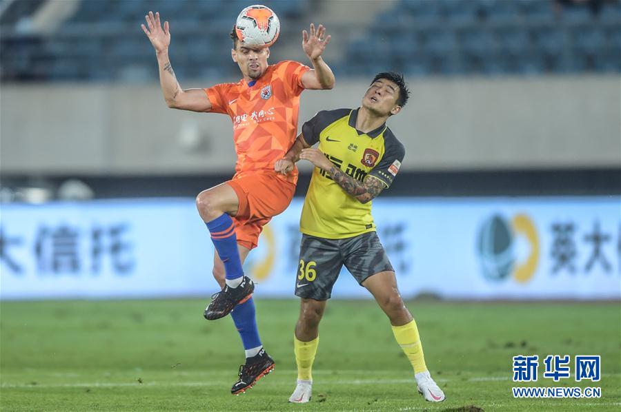 9月13日,广州恒大淘宝队球员何超(右)在比赛中与山东鲁能泰山队球员莫伊塞斯争顶。 当日,在2020赛季中国足球协会超级联赛第一阶段(大连赛区)第11轮比赛中,广州恒大淘宝队以2比1战胜山东鲁能泰山队。 新华社记者 潘昱龙 摄