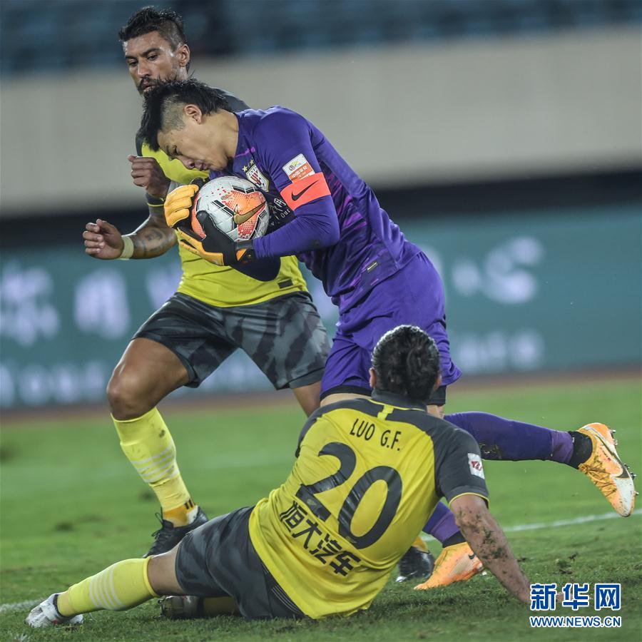9月13日,山东鲁能泰山队球员王大雷(右)在比赛中扑救。 当日,在2020赛季中国足球协会超级联赛第一阶段(大连赛区)第11轮比赛中,广州恒大淘宝队以2比1战胜山东鲁能泰山队。 新华社记者 潘昱龙 摄