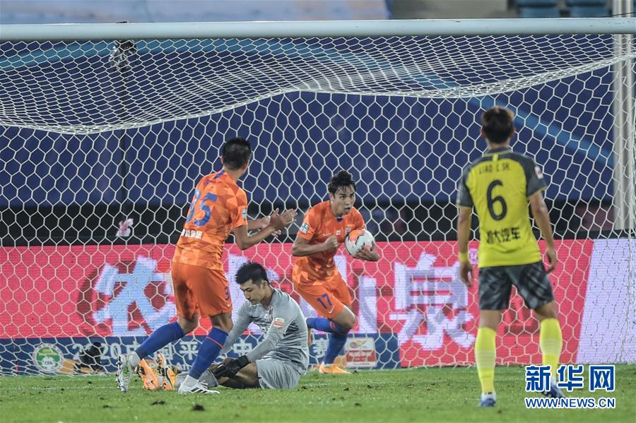 9月13日,山东鲁能泰山队球员吴兴涵(右二)进球后庆祝。 当日,在2020赛季中国足球协会超级联赛第一阶段(大连赛区)第11轮比赛中,广州恒大淘宝队以2比1战胜山东鲁能泰山队。 新华社记者 潘昱龙 摄