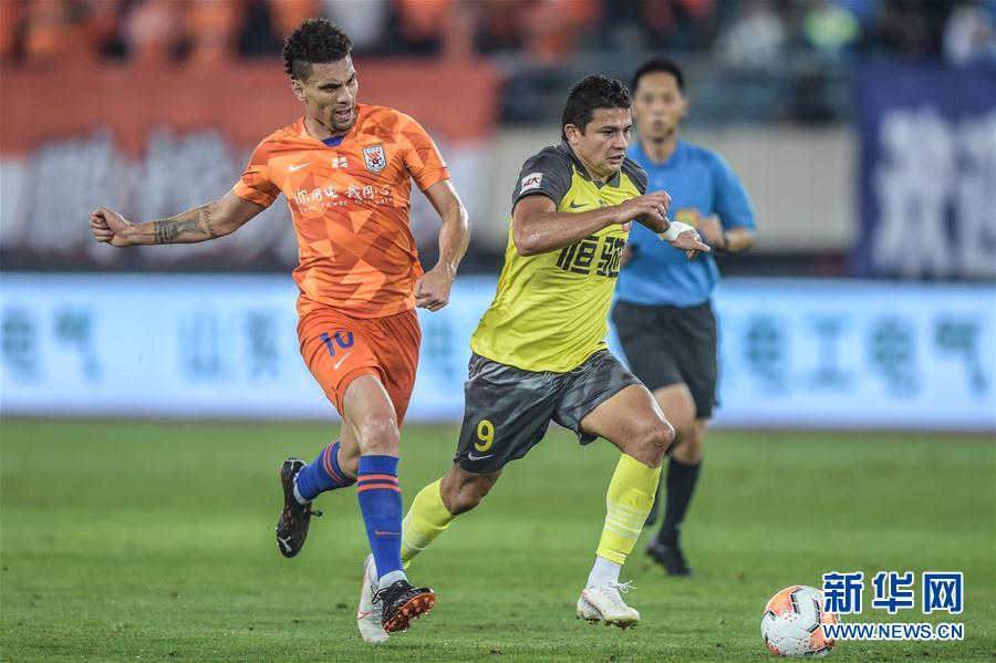 9月13日,广州恒大淘宝队球员艾克森(右)在比赛中带球突破。 当日,在2020赛季中国足球协会超级联赛第一阶段(大连赛区)第11轮比赛中,广州恒大淘宝队以2比1战胜山东鲁能泰山队。 新华社记者 潘昱龙 摄