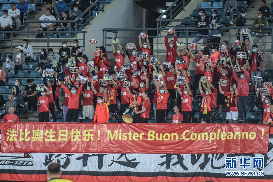 9月13日,到场观赛的广州恒大淘宝队球迷打出标语为主教练卡纳瓦罗庆祝生日。 当日,在2020赛季中国足球协会超级联赛第一阶段(大连赛区)第11轮比赛中,广州恒大淘宝队以2比1战胜山东鲁能泰山队。 新华社记者 潘昱龙 摄