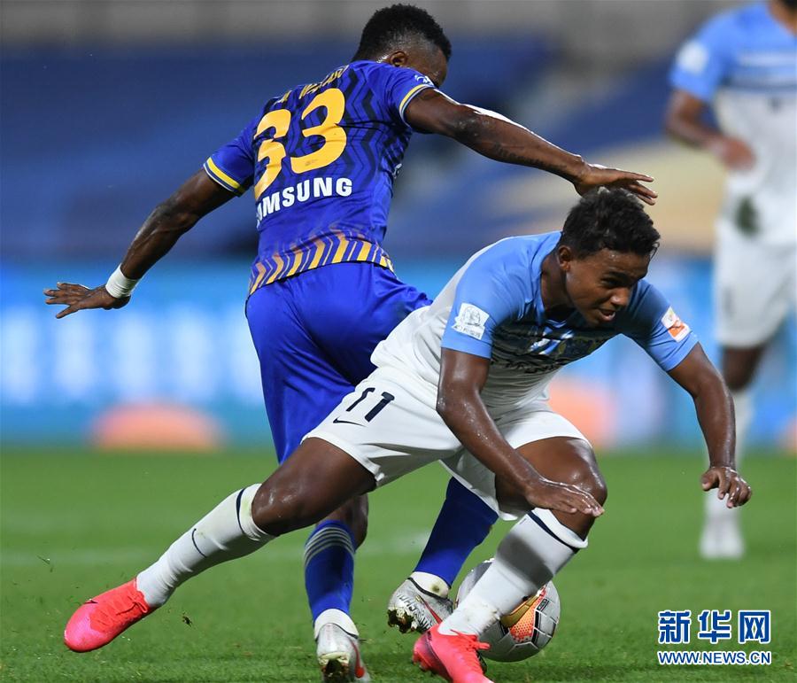 9月13日,广州富力队球员雷纳迪尼奥(右)在比赛中进攻受阻。 当日,在2020赛季中国足球协会超级联赛第一阶段(大连赛区)第11轮比赛中,江苏苏宁易购队以3比3战平广州富力队。 新华社记者 龙雷 摄