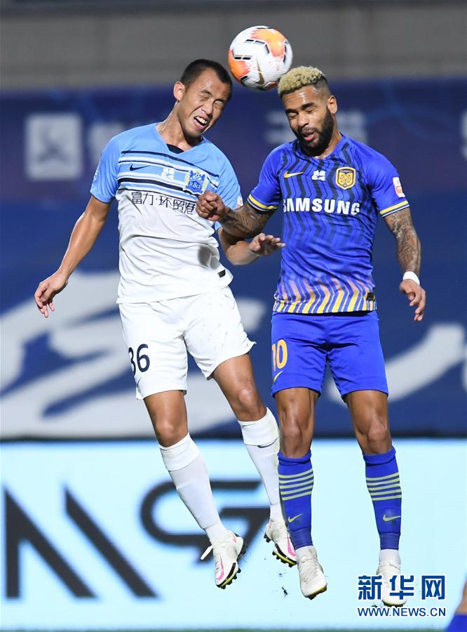 9月13日,江苏苏宁易购队球员特谢拉(右)与广州富力队球员黄政宇在比赛中争顶。 当日,在2020赛季中国足球协会超级联赛第一阶段(大连赛区)第11轮比赛中,江苏苏宁易购队以3比3战平广州富力队。 新华社记者 龙雷 摄