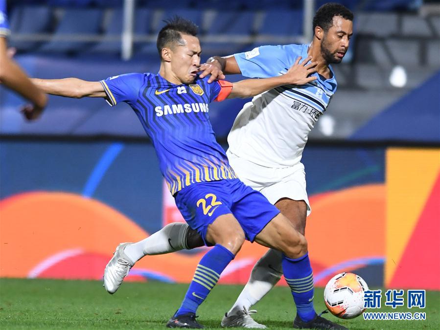 9月13日,江苏苏宁易购队球员吴曦(左)与广州富力队球员登贝莱在比赛中拼抢。 当日,在2020赛季中国足球协会超级联赛第一阶段(大连赛区)第11轮比赛中,江苏苏宁易购队以3比3战平广州富力队。 新华社记者 龙雷 摄