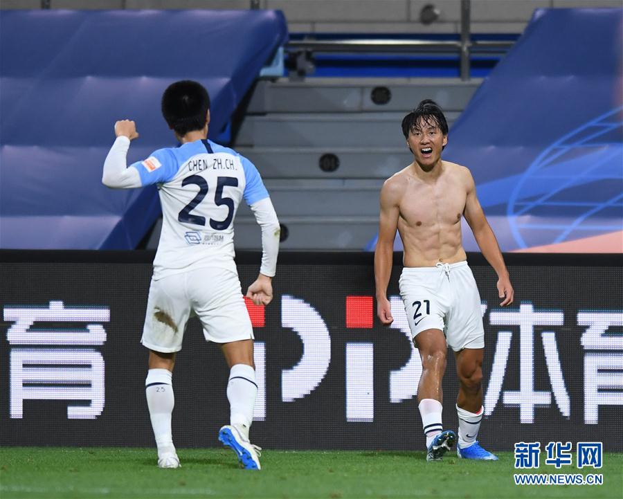 9月13日,广州富力队球员常飞亚(右)在进球后庆祝。 当日,在2020赛季中国足球协会超级联赛第一阶段(大连赛区)第11轮比赛中,江苏苏宁易购队以3比3战平广州富力队。 新华社记者 龙雷 摄