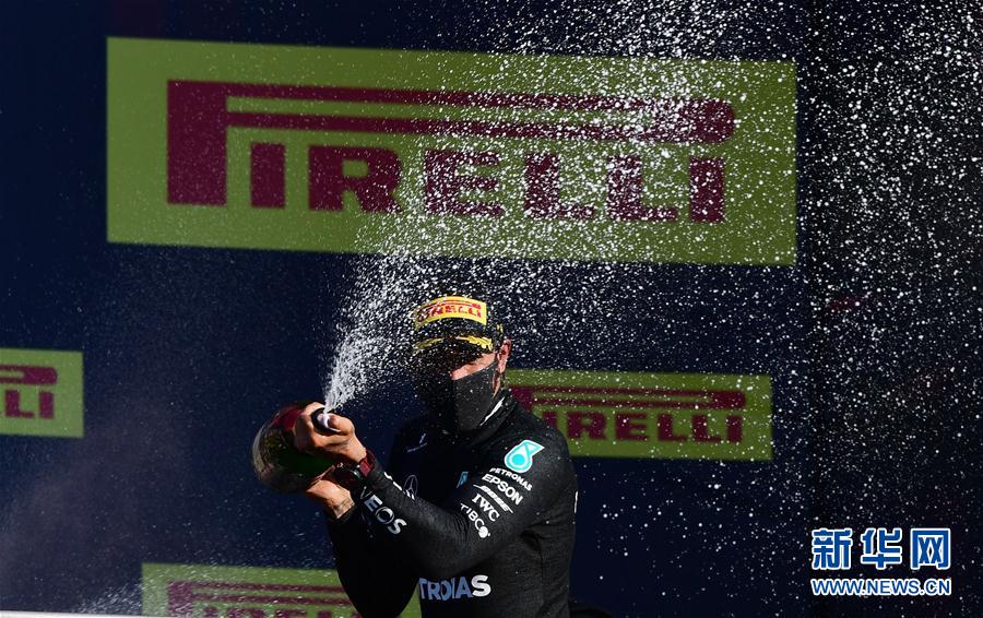 9月13日,汉密尔顿庆祝夺冠。 当日,在意大利穆杰洛赛道举行的2020赛季世界一级方程式锦标赛(F1)托斯卡纳大奖赛正赛中,梅赛德斯车队英国车手汉密尔顿夺得冠军。 新华社/路透