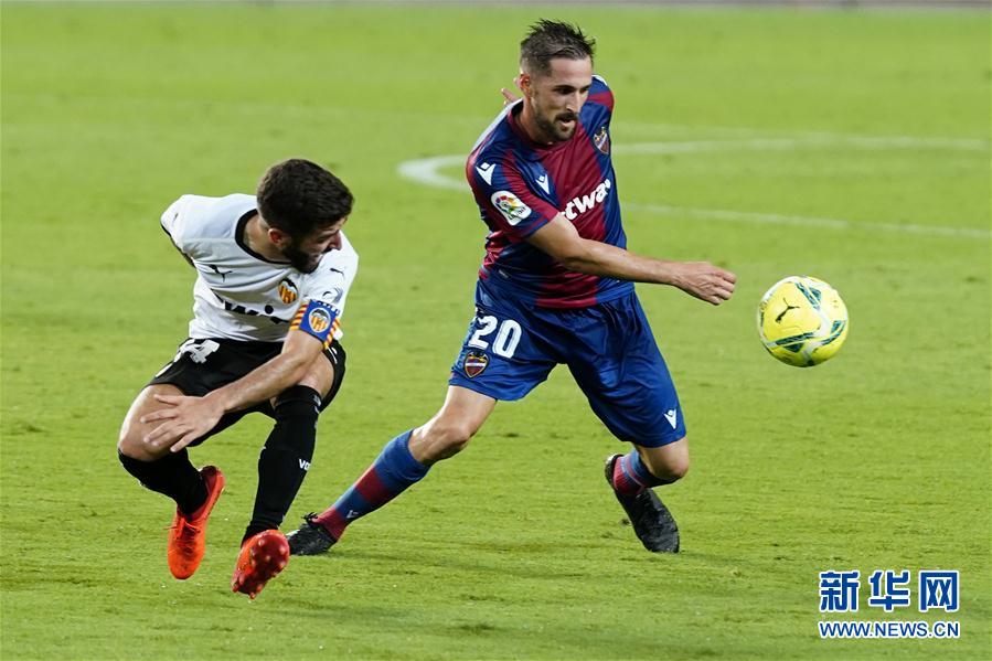 9月13日,巴伦西亚队球员加亚(左)与莱万特队球员米拉蒙拼抢。 当日,在2020-2021赛季西班牙足球甲级联赛第一轮比赛中,巴伦西亚队主场以4比2战胜莱万特队。 新华社/美联